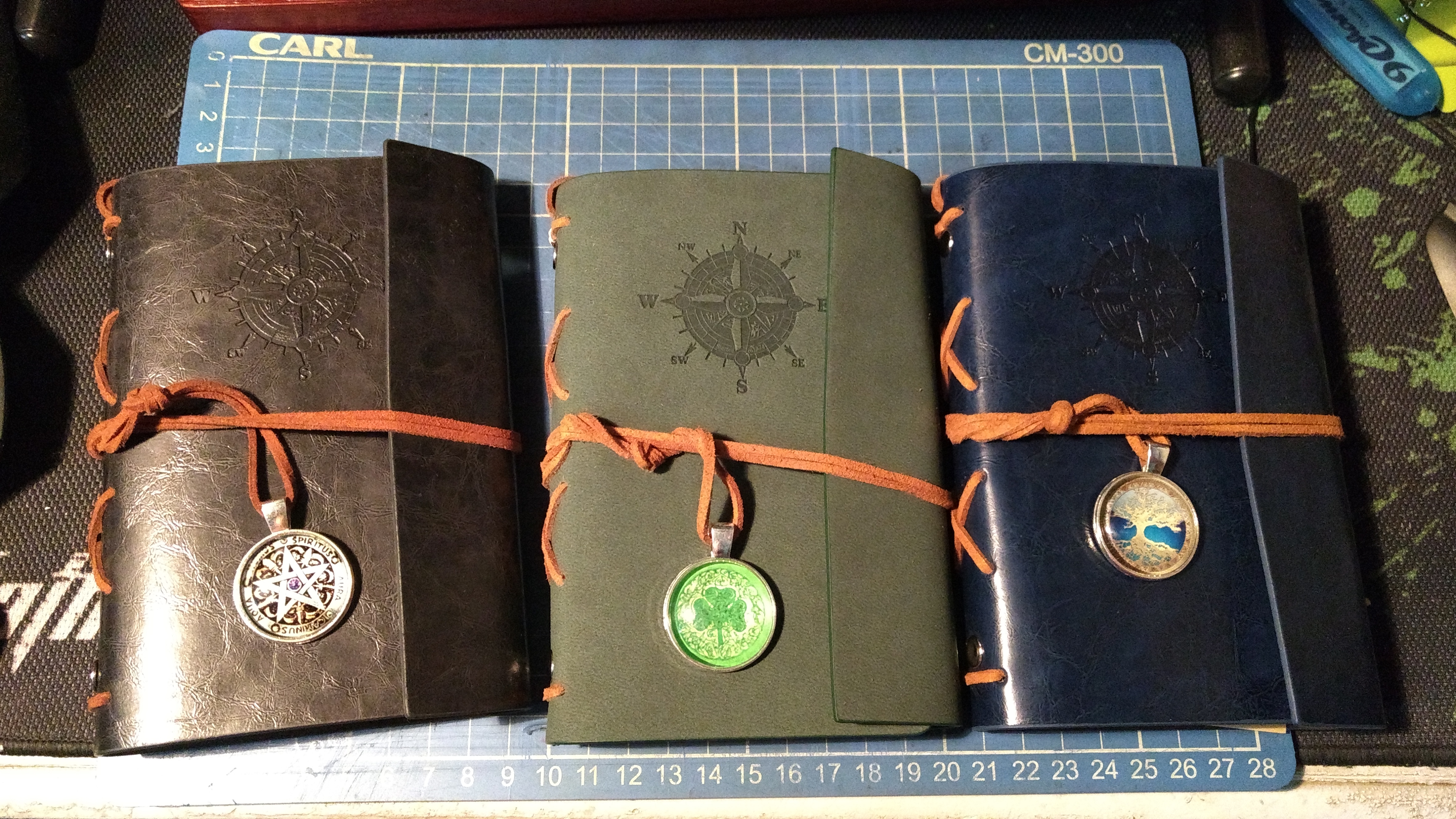 When the other materials did arrive (sooner than expected, I might add - they got here in less than 2 weeks, quite a feat considering they shipped from mainland China) I was pleased to find that the leather straps on the journals were easily removable. This made it possible to replace the stock charms with the other handpicked trinkets without needing to cut the leather. I just needed to untie the straps and slip on the pendants and charms.