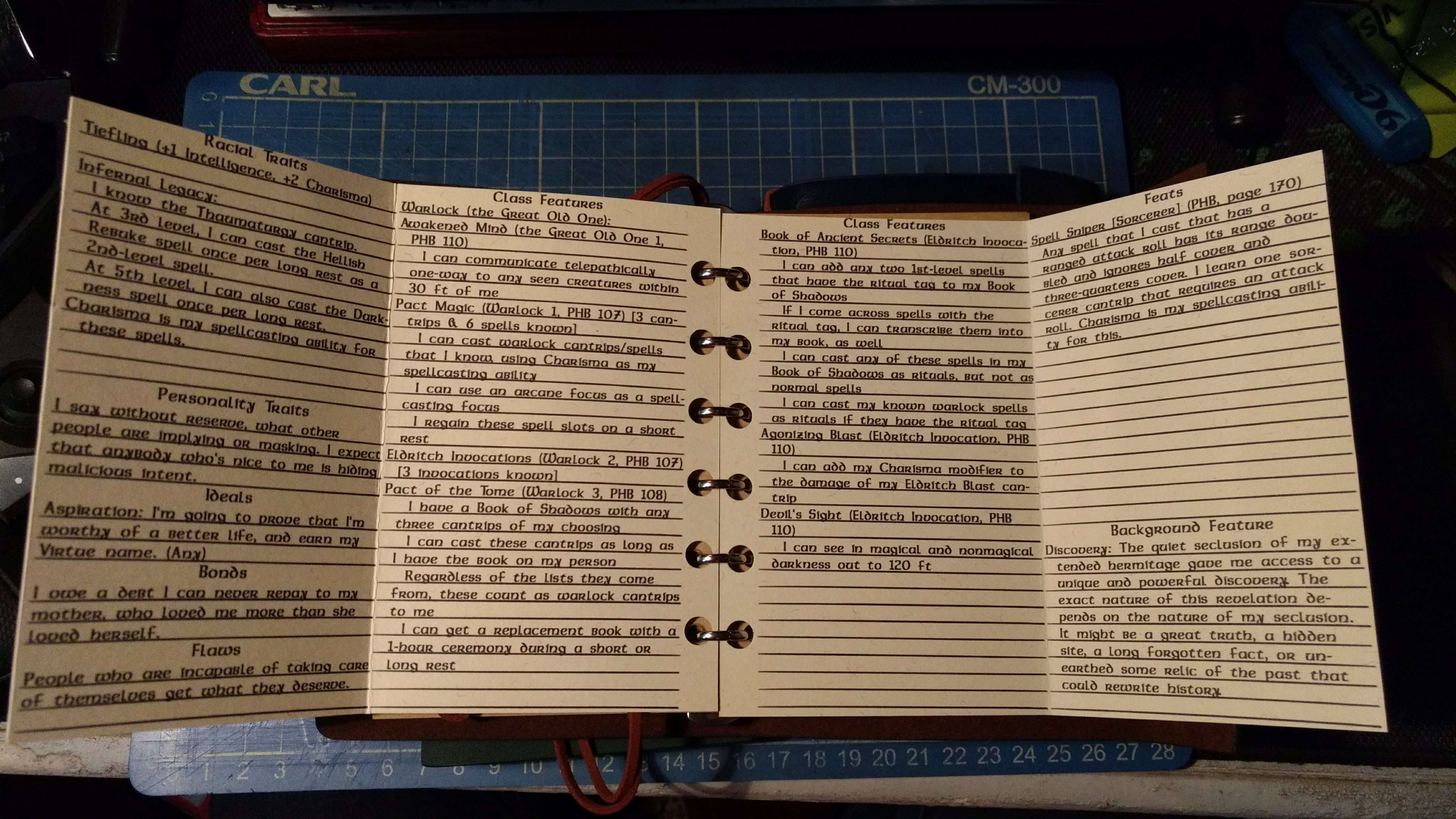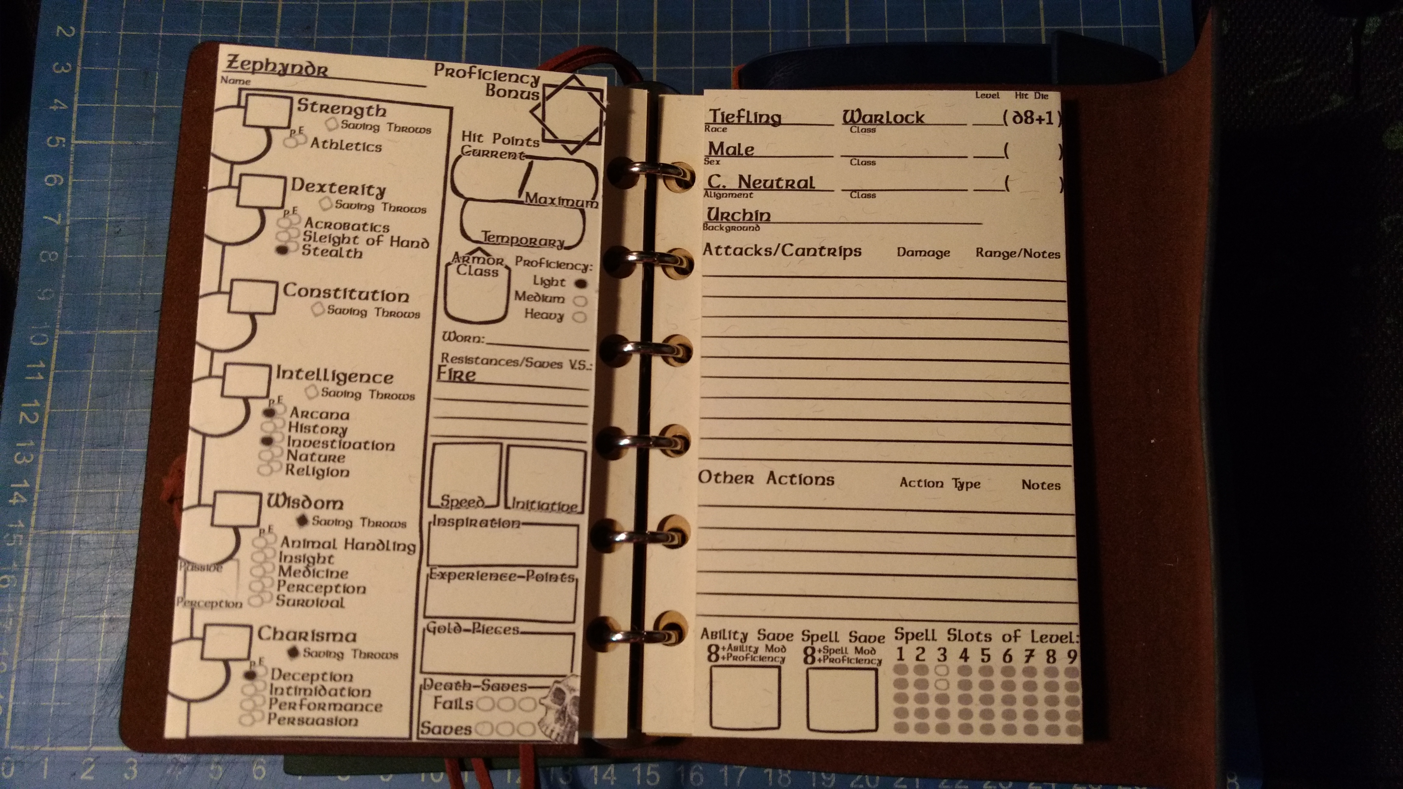 The difficulty of doing this though meant that I couldn’t use any pre-existing character sheet layout, so I had to design my own. I used PeterFitz’s A5 character sheet as a base from which I could modify my own to fit the unusual paper dimensions. I went through several revisions of the design before settling on one which balanced key information with limited availability of space.