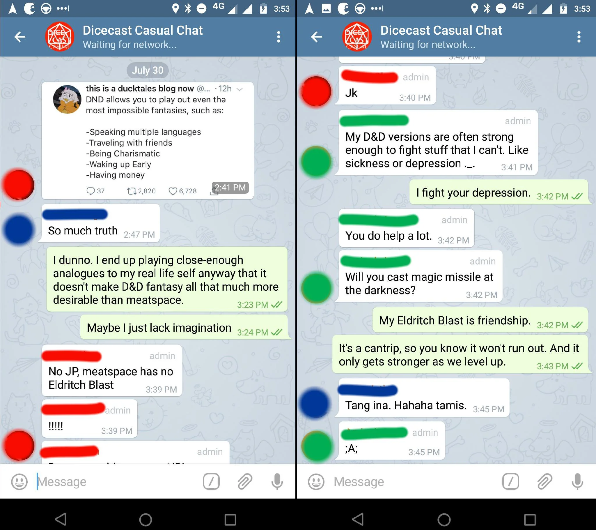I Cast Healing Word, Curing Friend’s Depression Condition Friendship, the most magical spell. Quotes Social Tabletop Thoughts July 30, 2018 at 09:22 UTC 1 minute Originally posted on Reddit Green Bro gave me permission to post this after I used my Action to Aid and cast Healing Word, curing his depression Condition.
