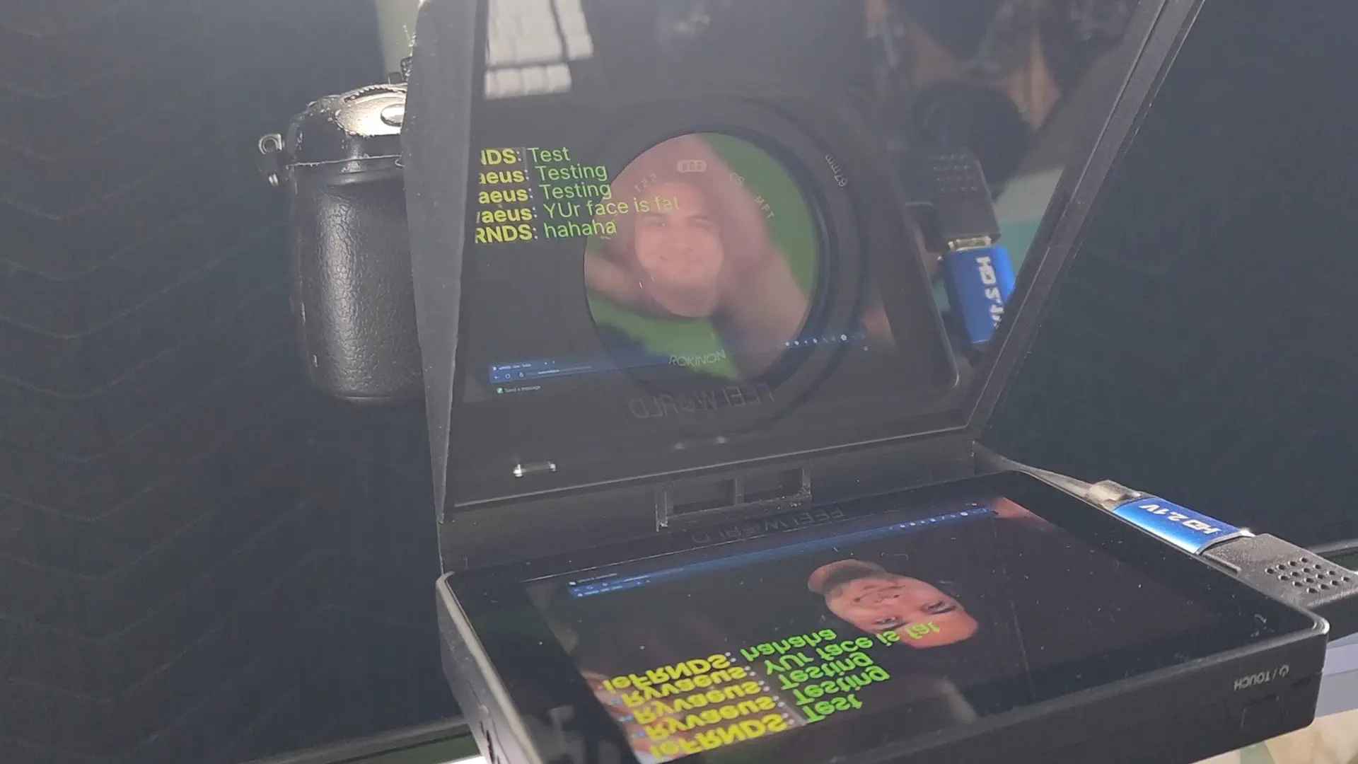 I don’t stream regularly these days but when I did, one of the things I liked most about my setup was my teleprompter chat. It went through many iterations; from a simple phone mounted as close to my webcam as possible, to an actual beam splitter teleprompter with a DSLR camera monitor screen replacing the phone. I enjoyed the more intimate feeling of being able to simulate looking at the audience while talking to them, even though this feeling was strictly one-way.