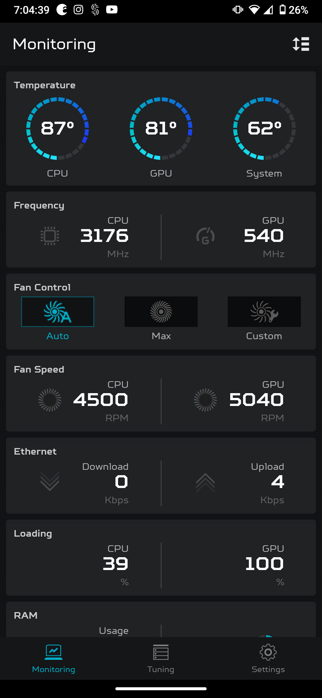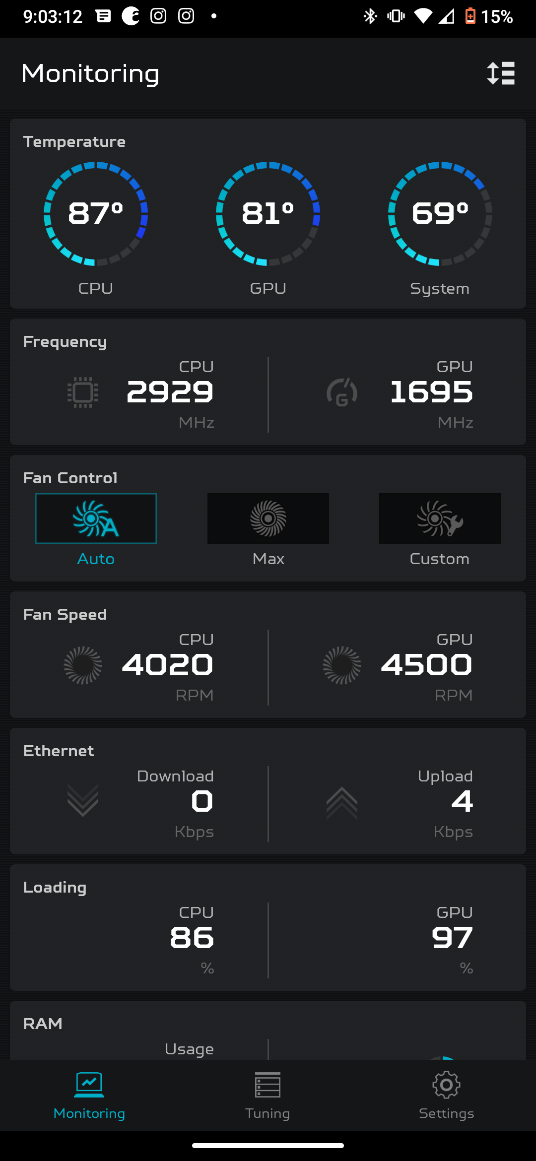 And here were the CPU/GPU temps, fan speeds, and core clocks:
